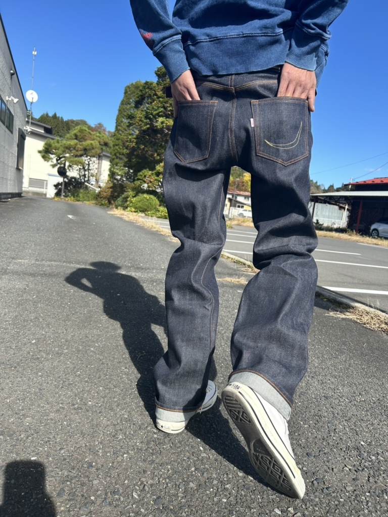 - 特徴としてはバックヨークの3本針による巻縫いとバックポケットへの三日月ステッチです。型はレギュラーストレートでジーンズ好きならどの年代の方にもお薦めできます。 14ozの生地をチョイスしリジットでの提供となります。 洗濯、乾燥後はウエスト約3cmレングスが約3cm詰まりますので考慮の上ご購入下さいませ。